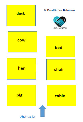 Po čase sa v zakladači nahromadia žlté lístočky z rôznych tematických okruhov: pomenovania členov rodiny, zvierat, nábytku, izieb, jedla, hračiek a pod. Vyberte na koberec všetky žlté kartičky a zadajte tri témy napr: domáce zvieratá, hračky, športy. Pre každú tému dieťa vyberaním z kartičiek “stavia vežu”. Výhody: