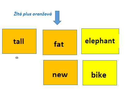 Vyberte päť ľubovoľných žltých katričiek a položte ich na koberec do stĺpca. Dieťa potom z oranžových kartičiek prikladá k žltému slovu prídavné mená, ktoré ho môžu významovo opisovať. Napr vyberiete slovo mother, dieťa môže pridať oranžové prídavné meno happy, tall a pod. Skontrolujete správnosť prekladom. Dieťa preloží spojenie oranžového a žltého lístka napr. šťastná mama, vysoká mama. Ak preklad dáva zmysel (kontrola na druhej strane kartičky), úloha je splnená správne. Za každý správny oranžový lístok pripíšte dieťaťu bod. Výhody: