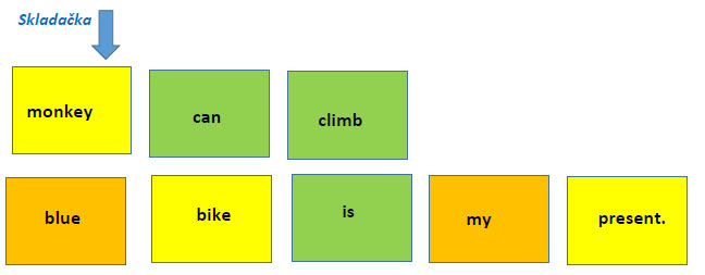 Pri tejto skladačke použijeme všetky kartičky. Dieťa si vyberie poslepiačky po dve karty z každej farby. Na koberci z nich potom skladá jednoduché vety vyberaním a pridávaním ďalších vhodných slov zo zakladačov. Vety ukladá pod seba. Ich správnosť si overí prekladom. Dbajte na to, že každá veta musí obsahovať žlté slovo (podmet). Za každú správnu vetu pripíšte dieťaťu bod. Výhody: