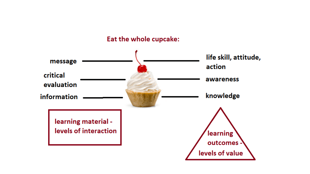 Their learning so far had reached the level of obtained knowledge – information set (Picture 1), that had not been even stored in their memory yet. The value of such learning outcome can be questioned. This is definitely not the result that education should aim for. Students can increase the value of any information gained within a learning process by personal critical evaluation that results in applying it in everyday life. To put it simply, to have students “eat the whole cake”, teaching should aim for outcomes that are usable and valuable. (Picture 1)