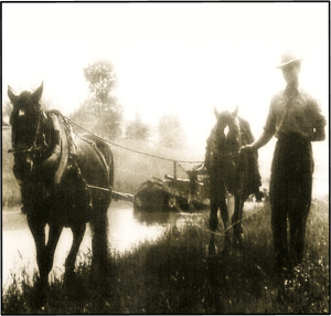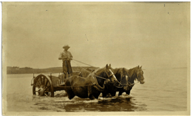 The two horses walking along the river bank are pulling the boat with cargo upstream.