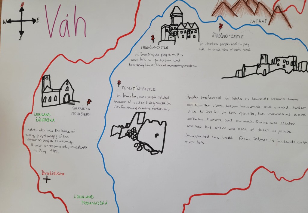The important ingredient of students’ work was critical thinking. Collected information had to be evaluated, compared, judged, ranked, categorized and interrelated. For example, children found out that unlike today, there were no bridges in the past. And the question was what impact it had on people’s everyday life, how they used to cross the river when necessary? What skills did they need to make it? The students collected the geographical information about the northern and southern basin of Váh. In that stage they were listing and recording the information. (Picture 3) But to get more effective outcomes, the tasks were designed to get more out of it. Students were to compare how the life was different in the northern part of the river from the one in the southern part. How did the two areas communicate together and why? (Picture 4) In this way they came up with new findings, new questions and new logical deductions. All in all they discovered the stories about tolls and forts on the river, about transport of wood and other comodities upstream and downstream, about the reasons why pilgrims wandered along the river etc. They became aware of the fact, that Váh was the main resource. (Picture 3) If there was no river, people wouldn’t have survived there.